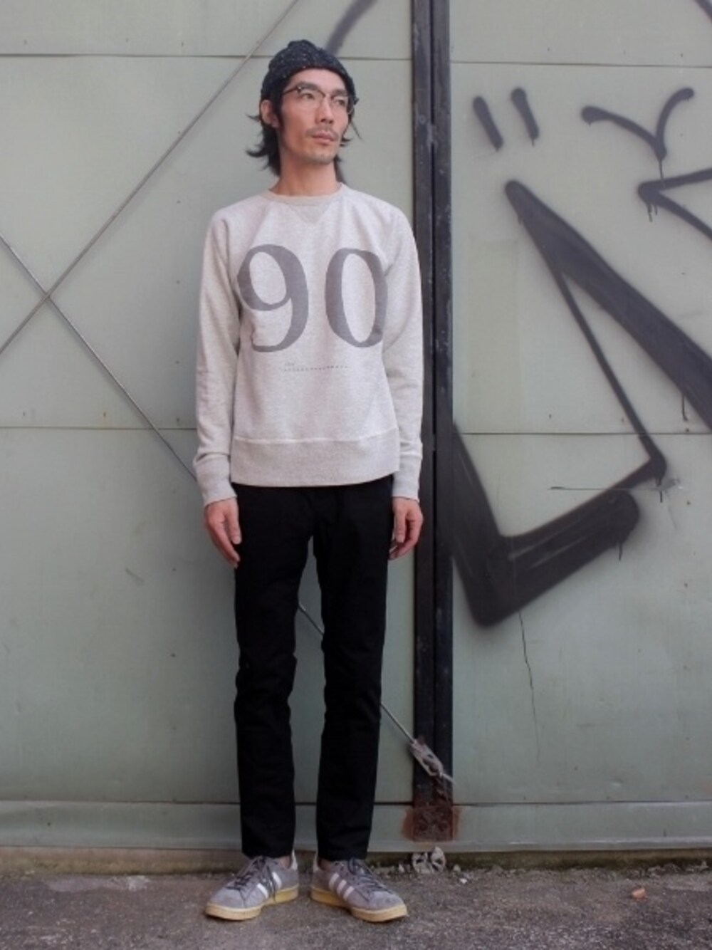 Amanjakania 30年代スウェット「90」 昔の織り機で再現。サイズ感は現代風にモディファイした鮮度あるスウェット。 「90」のインパクトがいいアクセントになります! 前Vでラグランとよく作られてます!