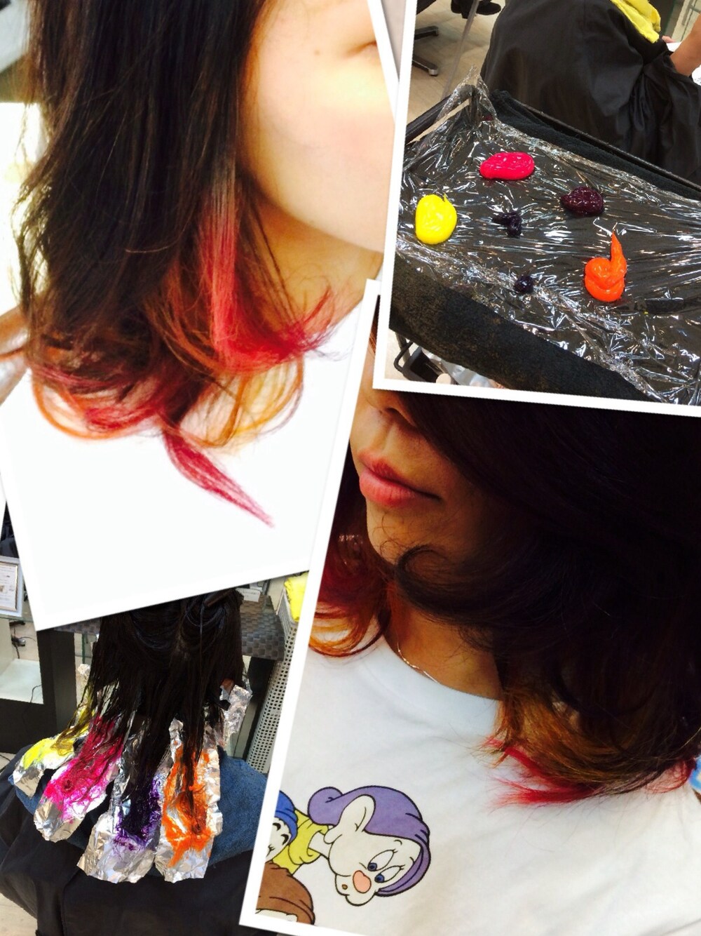 明日の朝カナダに出発しまーす! 渡航前に髪染めた♥️ ピンク、オレンジ、イエロー、紫☻ 目立ってなんぼぢゃ(*゚ー゚)v♪