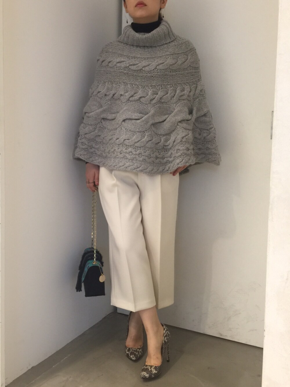 ケーブルニットポンチョの中に薄手のタートルを入れてメリハリ感を。