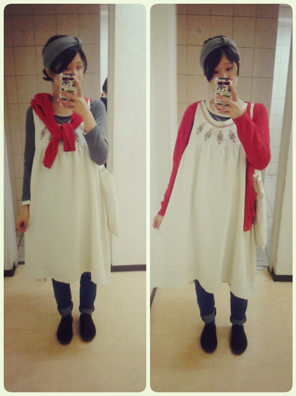最近曇ってばっかり やから明るめの色を着たかった(。・ω・。) 刺繍ワンピース/古着、ブランド不明 カーディガン/Arrow デニムパンツ/ブランド不明