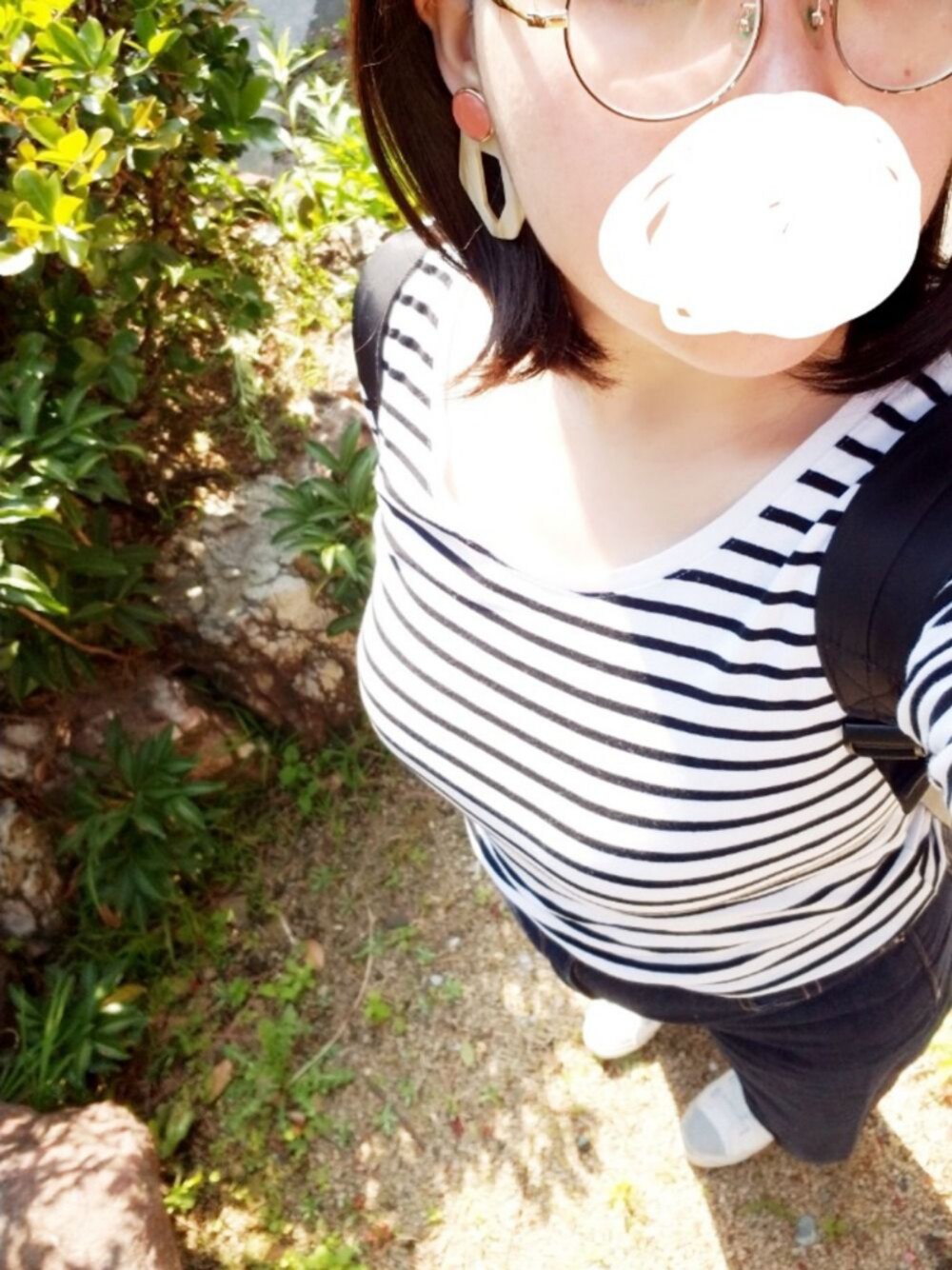 閲覧ありがとうございます。 今週最後の保育園へ。 ボーダーのロンTにコクーンシルエットのデニムを合わせました。 ピアスを春色に。 薄着になってくると邪魔な胸が目立つ… 小さくしたい。 ピアスが見えるようにマスクはずしました。 撮影場所は家の小さな小さなお庭です。