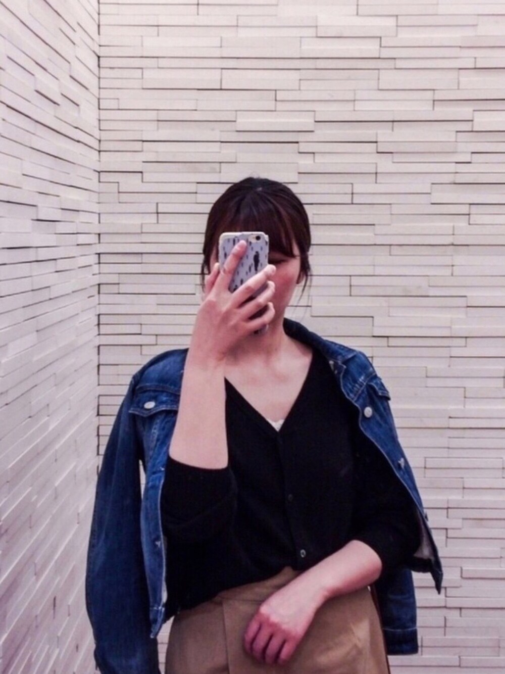 カーディガンは 前後どっちでも着れる優れもの 今日はカーディガンで着ています スカートはサスペンダー付きです カジュアルなコーデの時は サスペンダーを付けようかな