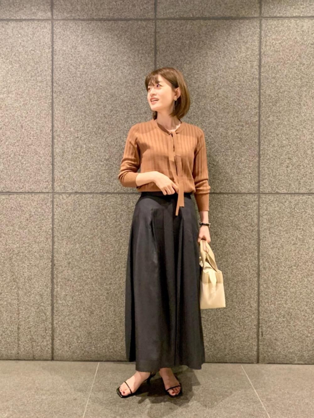 30代/161cm/骨格ウェーブ/普段サイズ36〜38/着用サイズ38 【ランダムリブボウタイニット】 サイズ感: ジャストなサイズ感です。リブがランダムに入っており、ラインを拾いにくいです。 素材感: 柔らかく、伸び感があります。 着用感: 一枚でも使いやすく、オンオフで着回せます。 【タックギャザーロングスカート】 サイズ感: 腰周りはすっきりと、後ろのゴムで締め付け感は少ないです。 素材感: 柔らかい素材感で、さらっと着れます。 着用感: 深みのあるカラー展開で、光沢感が上品です。カジュアルでも、綺麗目でも、色々なコーデと相性が良いです。