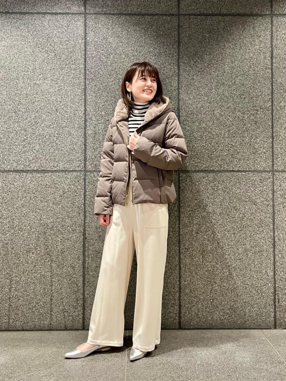 30代/161cm/骨格ウェーブ/普段サイズ36〜38/着用サイズ38/パンツ着用サイズ36 【ファーフードショートダウン】 サイズ感: 窮屈すぎないサイズで、着膨れしないデザインです。丈は長過ぎず、すっきりとしたシルエットです。 素材感: 保温性がかなり高いので、インナーはコンパクトなものが◎ 着用感: とても軽い着心地で、毎年大好評のダウンです。ファスナーはゴールドで高級感があります。 【コスミカルウォームイージーワイドパンツ】 サイズ感: リラックス感がありながら、すっきりとしたシルエットです。 素材感: 柔らかく、内側の起毛で暖かいです。 着用感: 総ゴム仕様で履きやすく、着回し抜群のパンツです。 【ボーダーリブタートル】 サイズ感:フィット感のあるサイズ感です。着丈もしっかりとあるのでウエストインもしやすいです。 素材感: 柔らかくチクチク感があまり感じられない素材感です。 着用感:フィット感があるのでインアイテムとして大活躍します。