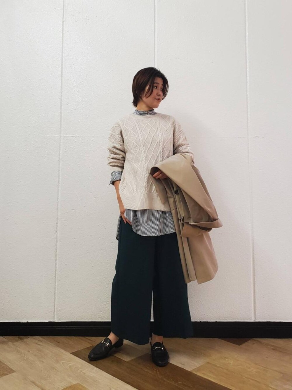 スタッフ身長:155cm/普段サイズ:トップス38(M)、ボトム36~38/着用サイズ:アウター:38、トップス38 ボトム36/トップス:トレンドのレイヤードコーデです!後ろ姿も可愛いリボンのニットに重ね着にぴったりな首もとプリーツのシャツです😃 ボトム:春夏にも登場したパンツが秋冬にも出ました✨ 早い時期から取り入れられ、何を着たらいいか分からない方にお勧めしたい1枚です🐱