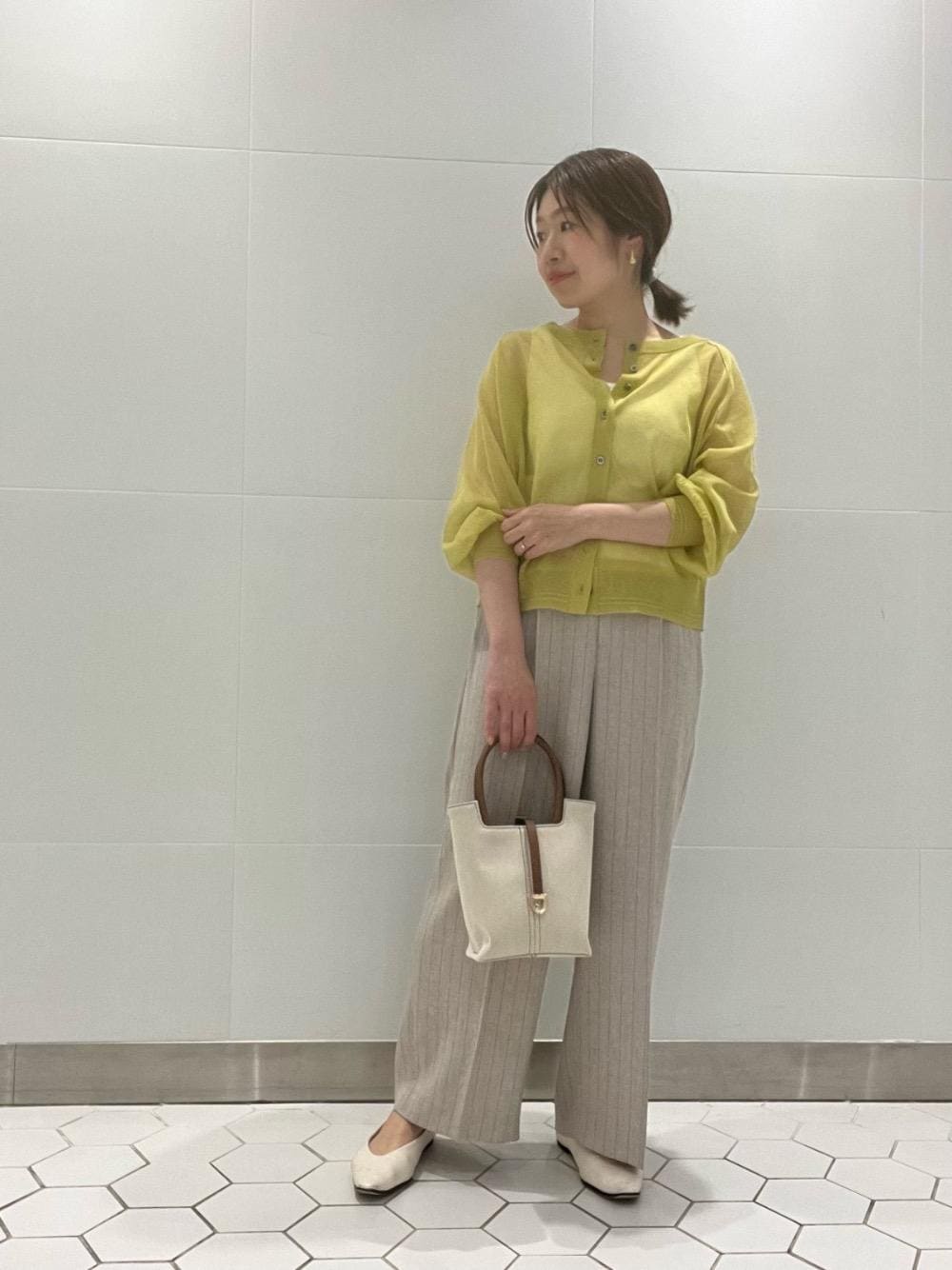 30代後半/156cm/骨格ストレート/普段サイズ38/着用サイズ38 【シアー前後2WAYクルーカーディガン】 サイズ感:少しゆとりあり。特にお袖のボリュームがある為二の腕をカバーしてくれます。 素材感:さらっと軽い着心地。 着用感:前後だけでなく、ボタンの掛け方次第で印象も変わり、キャミワンピースやデニムパンツ、きれいみえスカートなど幅広いスタイルに相性の良い1枚。 【リネンライクストライプタックワイドパンツ】 サイズ感:ウエストは、通常の38サイズより少しゆっくりしており楽な履き心地。 素材感:少しザラっとしたリネンの風合いだが、とても薄手で柔らかい。 着用感: 裏地もないので涼しく、とても楽な軽い履き心地。少し広めなワイドでセンタープレスがあるので、きれいめ感もありつつどこか抜け感もあり様になるパンツ。