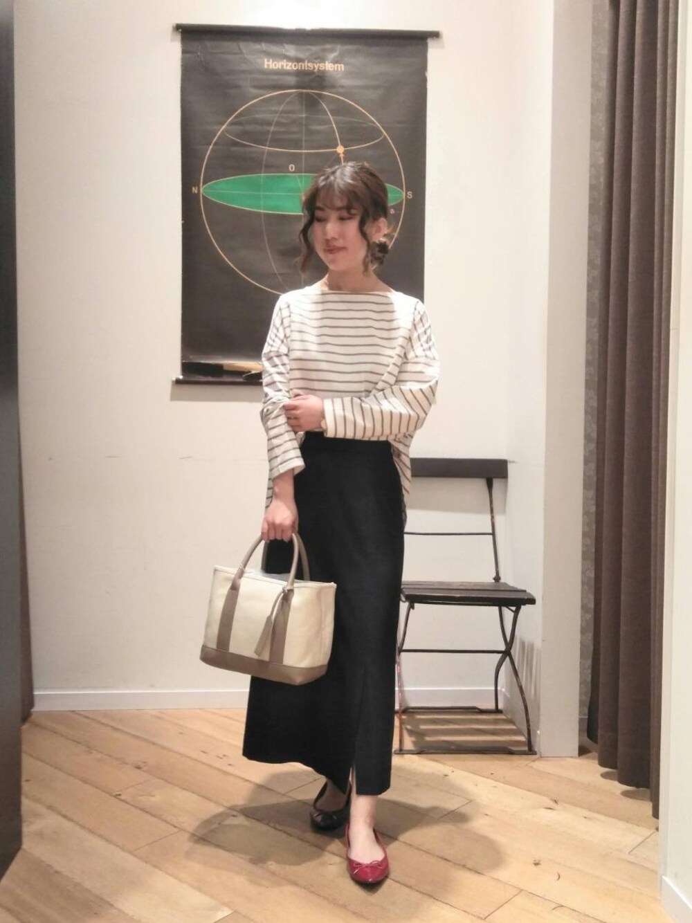 身長157㎝/普段サイズ36(S)〜38(M)/着用サイズ 、トップス38(ワンサイズ)、スカート36、靴(私物) 【スタイリング】 トップスは程よいハリ感のある素材でシルエットがゆったりしてるので着心地も楽です。 スカートは柔らかいデニムライクの素材でスリットも入っているので動きやすくお出掛けにもぴったりです♪ボーダーのカットソーにデニムのスカートを合わせてフレンチカジュアルなスタイリングに仕上げました*