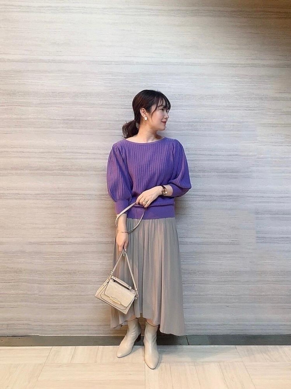 パープルニット🟣【身長159㎝ 着用サイズ38】ぐっと目を惹く鮮やかな色味のニットが入荷しました!たっぷりボリューム袖に、インをしなくても全体のバランスが取りやすい丈感!1枚でさらっと着て頂きたいニットです。涼しくなった頃に丁度良いアイテムは、是非早めにチェックしてくださいね!