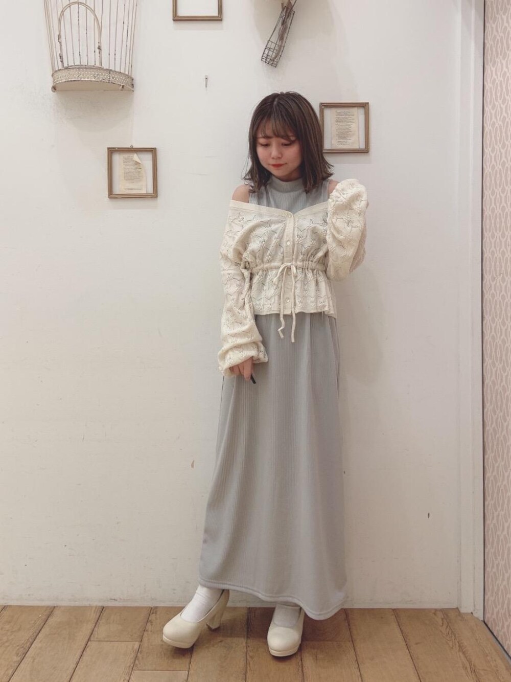 大人可愛い新作コーデ🎀💗シャツセットですが、シャツをニットカーディガンに変えて今年トレンドの肌見せコーデに仕上げました!