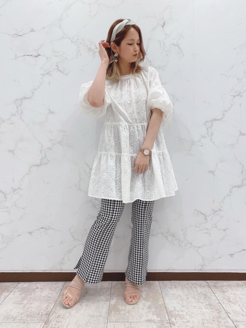 大きめ花柄レースとティアードが夏らしいデザイン🌻袖ボリュームでふんわりした印象に😊✨1枚でも着れちゃいますが、パンツ合わせが今年のトレンドです😘