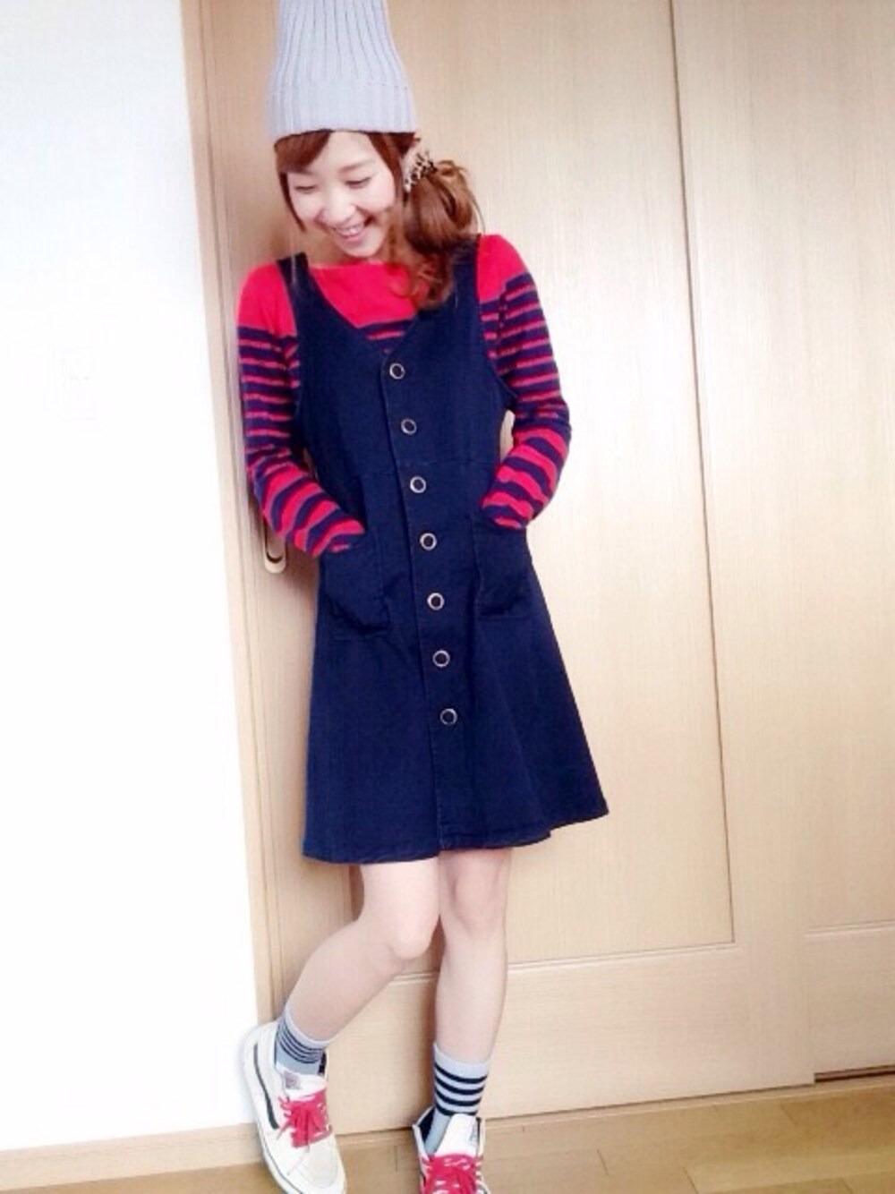 1日暑かったので☀️ 今日のコーディネートはUNIQLOの赤ボーダーカットソー1枚にデニムジャンパースカートを合わせただけのシンプルコーディネートです😂 でもそれだけだとかなりシンプルになるのでニット帽をかぶりました✨ 朝撮ったんですが載せる時間がなかったので💦今載せちゃいます😂 UNIQLOの赤ボーダーは安いのに生地がしっかりしていて1枚でも着れるし中にシャツを着ても形が崩れないのでオススメですq(q'∀`*) 今日も見ていただきありがとうございます❤️