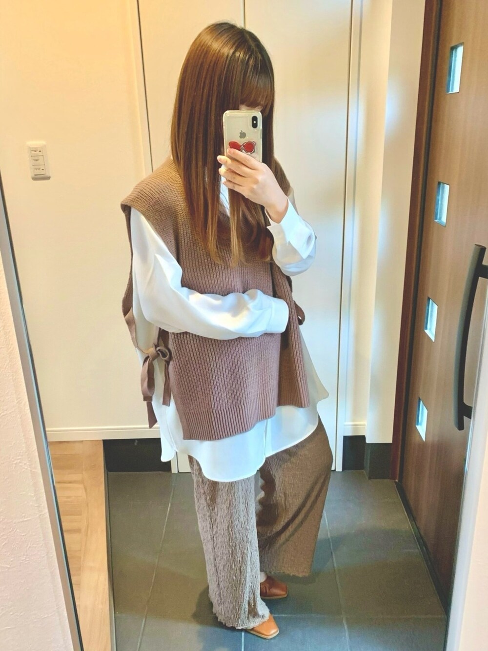 allジーユーコーデ❤︎ やっぱり持っている服は 汚れても大丈夫な様にプチプラが多め😣 大好きなブラウン系でまとめてますෆ̈ ニットベストのサイドリボンがお気に入り☻︎