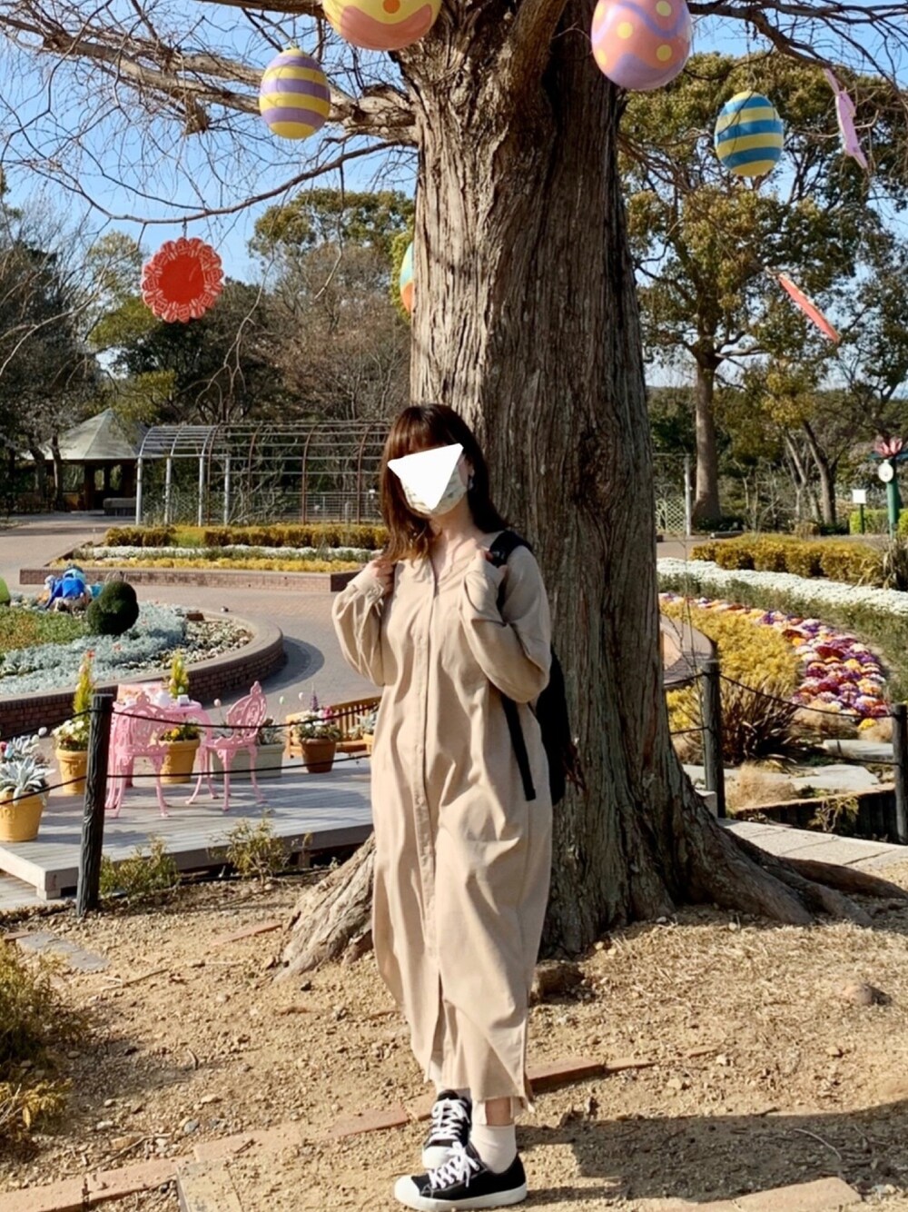 動物園コーデ。 イースターがかわいい🐰🐣🥚 ポイントは 手作りマスク(母作)😷 見えてないけど、コーデに合わせて柄を選んでます。