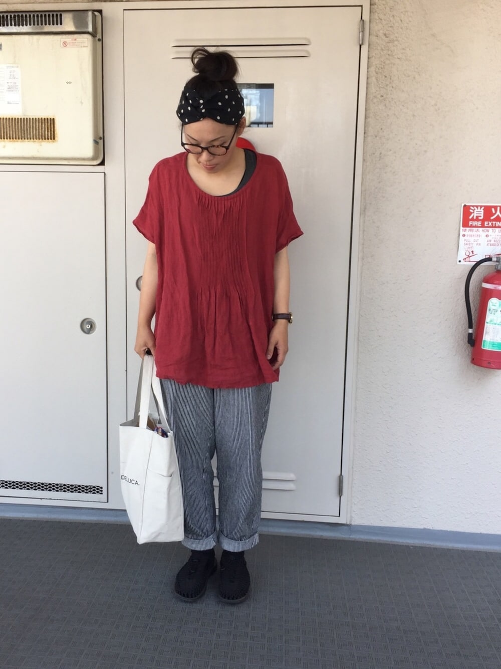 今日は暑かった… 夏仕様のコーデですわ。 赤にドットなかなか好きやわ。 いつも🖤&saveありがとございます☺︎