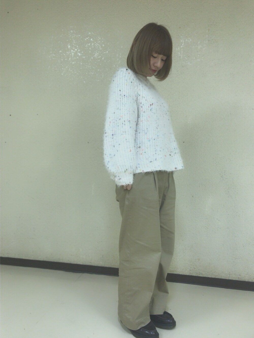 店頭着用コーデ💁 カラーネップニットはふわふわ感が女の子らしくて可愛いんです😍 チノパンは最近のヘビロテアイテムです🐶