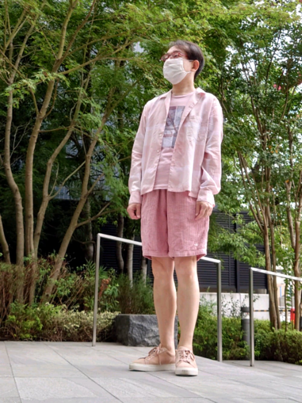 少し涼しいので長袖ですがパンツは暑くて短いのに履き替えました。そのため全部ピンクになってさし色がなくてややぼんやりしてます。