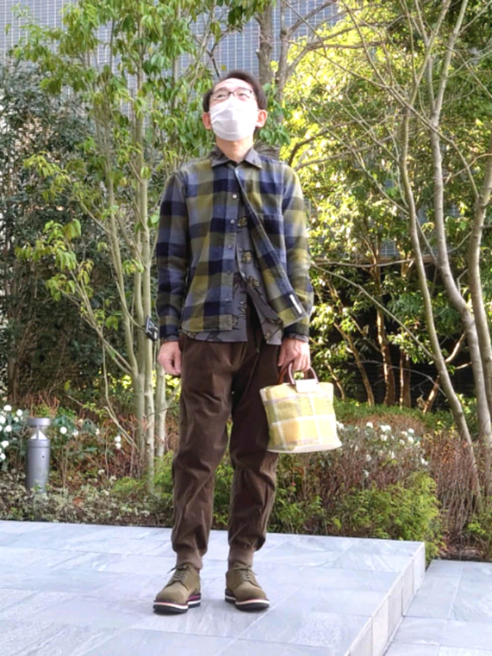 40ct&525の羽織りものとTAKEO KIKUCHIの20AWのシャツです。 今日は、かなり暖かくて、コートもニットもやめました。グレーのシャツは僕的には地味過ぎるので、バッグでバランスしました。 パンツと靴は40ct&525の20Wのです。