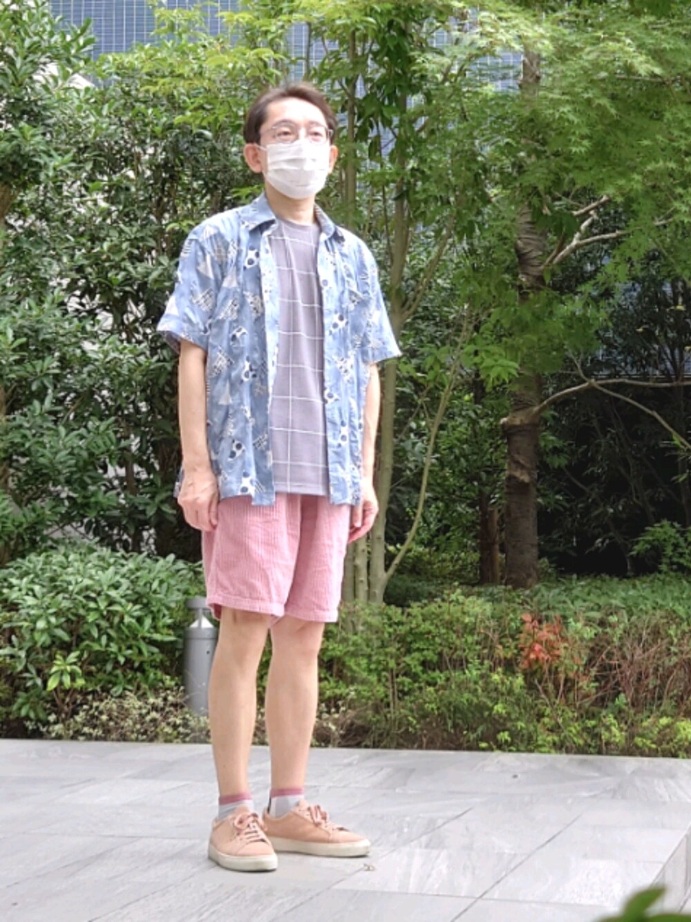 40ct&525の21SSの塩縮シャツです。アイロンが掛けづらいです。中のTシャツはBOYCOTTです。 水色ピンクとピンクとグレーの合わせにしました。 今日は、曇りですが結構暑いです。