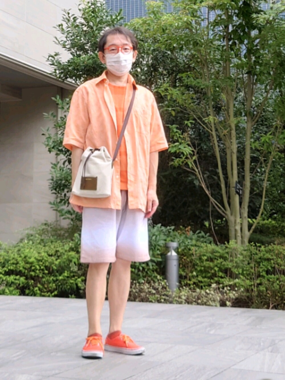 40ct&525の21SSのシャツです。イタリアのカルロバセッティのです。コットンですが、ふわふわの触り心地です。 なんか、またちょっと暑くなったので、オレンジに戻りました。中は、BLACK LABELです。 パンツはTAKEO KIKUCHIと同じワールドのBace Controlです。ネットで買いました。 さすがに10月に入ったら短いパンツはやめます。