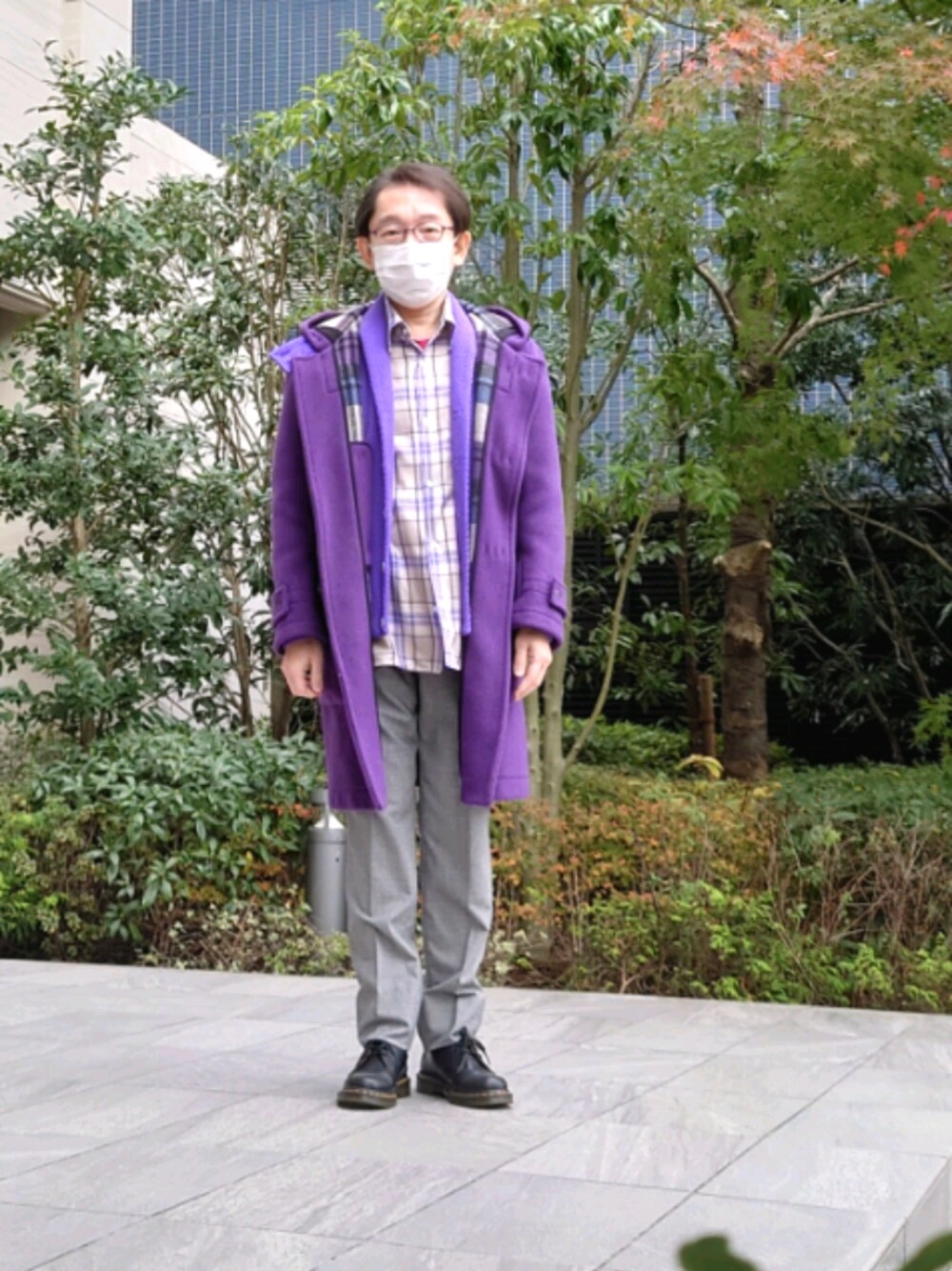 パープルでまとめました。 ダッフルコートはアーバンリサーチsonny labelです。ショールカラーのニットとパンツはTAKEO KIKUCHI。ロングシャツはtk.TAKEO KIKUCHI。 靴はDr.Martensです。メガネもパープルです。 今日は排水管清掃が来るというので、昨日は水回りの大掃除をしたので、ぐったりです。 夜にいつものカフェ・コムサに行って気分を戻そうと思います。今日は曇りで結構寒いです。