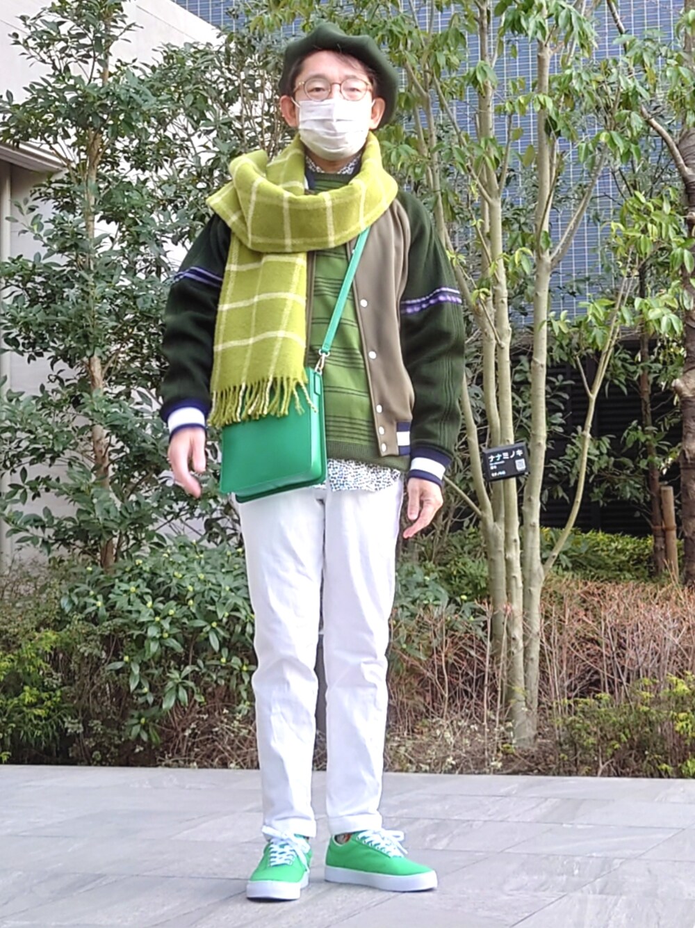 40ct&525の22SSのスタジャンとおそろいのベレー帽です。3社タイアップのです。缶バッジがそれぞれ3個づつ付いてて、ベレー帽にだけ付けました。中のニットとパンツは少し前の40ctで、中のシャツは40ct&525の21AWです。靴はLACOSTEです。見えてませんが、スヌーピーが描いてあるのです。その色に合わせてSENSE of のバッグを下げました。マフラーはTWEEDMILLです。今日は新宿高島屋と有楽町マルイTAKEO KIKUCHIに呼び出されたので、出掛けるとこです。