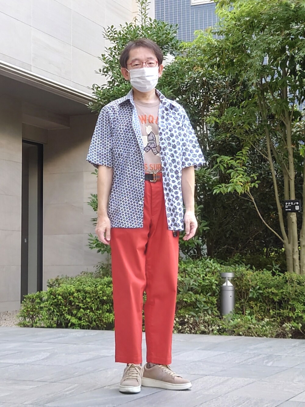 40ct&525の22SSのシャツとパンツです。中のTシャツは、40ctの21SSです。ベルト、ソックス、靴はTAKEO KIKUCHIです。 まだ昼間は暑いので、半袖です。シャツは小花柄で真ん中で切り替えです。 いつになったらセットアップが着られる気温になるのか、待ち遠しいです。