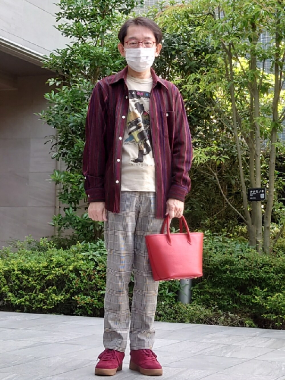 40ct&525のシアー系のシャツです。中は40ct&525の23SSのロンTです。靴も40ctのAF-1です。ソックスも新宿高島屋TAKEO KIKUCHIでかったのです。バッグはTAKEO KIKUCHIのオーダーバッグです。今日は昨日と比較して暑かったので、こんな感じです。赤とベージュでまとめました。