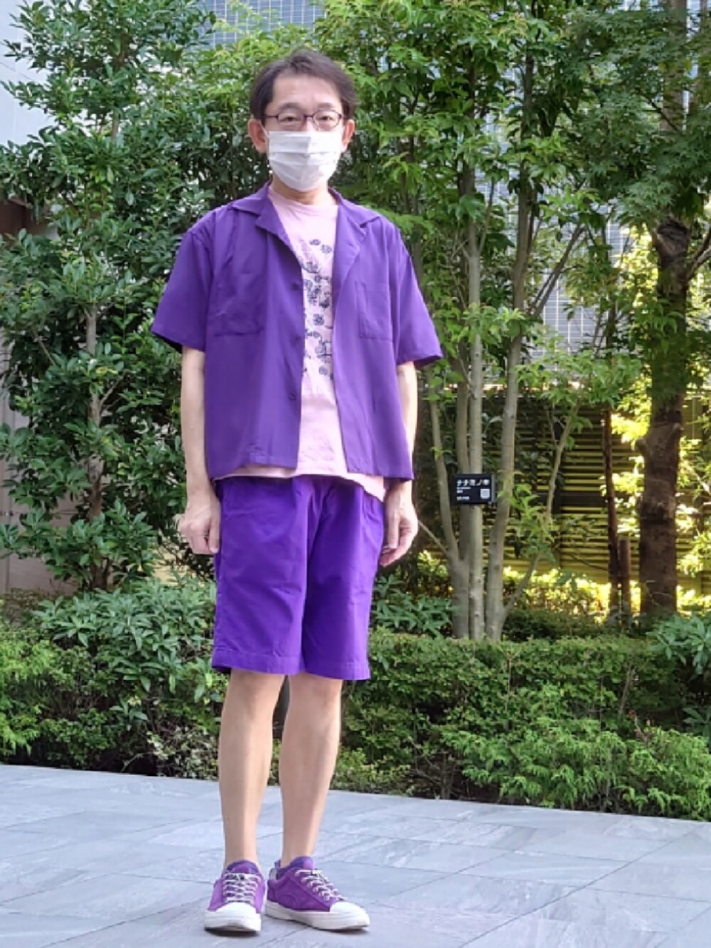 Sense of Placeのオープンカラーシャツです。レーヨンっぽい素材で柔らかいです。中のTシャツは40ct&525の今季のです。パンツはネットで買ったのです。ソックスはTAKEO KIKUCHI、靴はアバハウスで買ったのです。今日はパープルでまとめました。今日も暑いです。