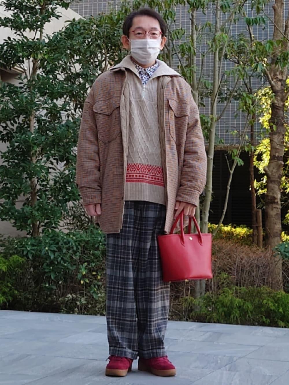 40ct&525のハーフジップニットです。少し前のです。中のシャツは40ct&525のMONTIの生地のです。パンツはabahouse、バッグとソックスはTAKEO KIKUCHI、靴は40ct&525のAF-1です。アウターはPENLETONです。久しぶりにハーフジップニットを着てみました。今日は比較的暖かいです。