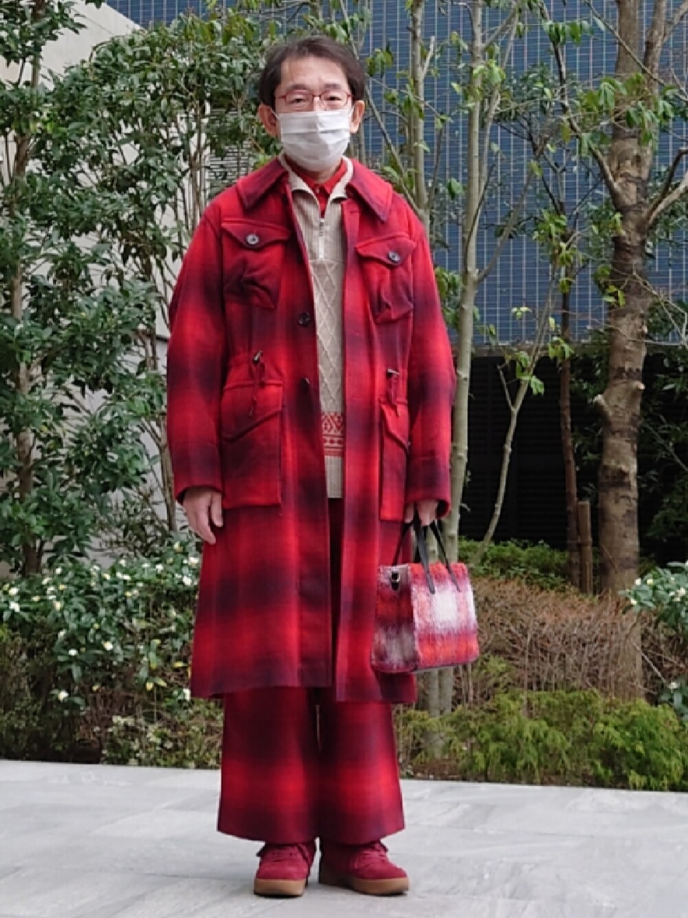40ct&525の22AWのコートです。パンツは同じ生地のですが、23AWとして有楽町マルイ別注で出たものです。中のハーフジップニットと赤いシャツ、靴も40ctです。ベルトはLACOSTE、ソックスはサンタクロースが描いてあるのですが、クリスマスに履かなかったので履いてみました。Chupです。バッグはAfternoon Tea livingです。 本当は春っぽいセットアップを着るつもりだったけど、あまりに寒いので冬のカッコに戻りました。