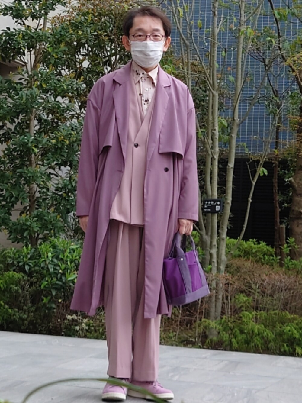 tk.TAKEO KIKUCHIのピンクのセットアップです。コートもtkです。パンツは40ctのサスペンダーで吊ってます。中のシャツはPaul Smith Collectionの24SSのです。ソックスは40ct、靴はAdidasスタンスミスです。桜が満開なので、ピンクにしました。あと、有楽町マルイTAKEO KIKUCHIのKPがららぽーとTOKYOBAYに異動になったので、様子を見に行く予定。その店舗はtk.の扱いがある店舗なので、それもあってtk.です。桜は満開なのですが、お天気が曇りで、やや残念です。