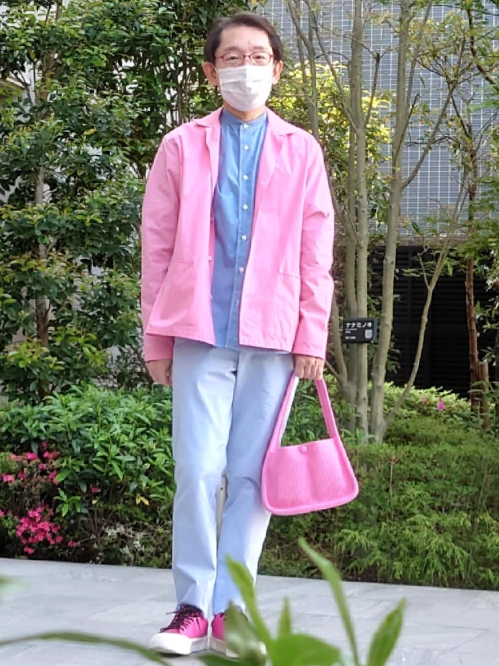 STUDIO Nicolsonの羽織物をメインにピンクと水色でまとめました。中の水色のシャツとパンツはTAKEO KIKUCHI、ベルトはGAP、ソックスはグリーンレーベル、靴はDesigual、バッグは、SALON Adam et Ropeです。バッグは昨日、銀座の東急プラザで買いました。 今日は意外にやることが多くて、街に出られず、コンビ2にしか行けませんでした。残念。