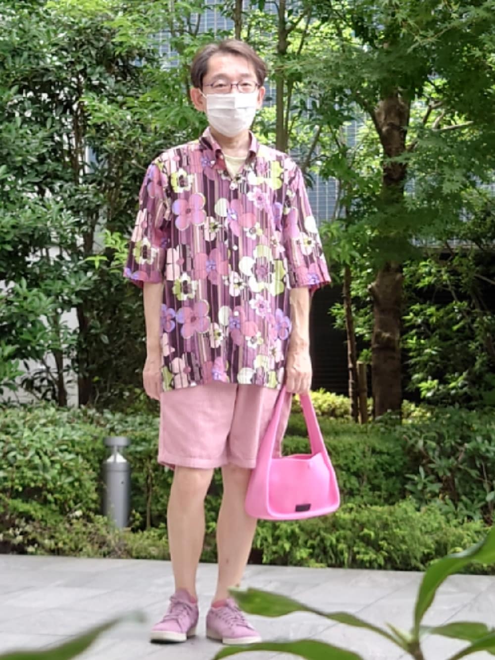 パープルの花柄シャツです。ボタンダウンです。柄に黄緑色が入っているので、中のTシャツは黄緑色です。 パンツはコーデュロイのハーフパンツで、Ocean Pacific、靴はadidasスタン・スミス、バッグは、SALON Adam et Ropeです。今日も暑かったです。明日から夏休みです。