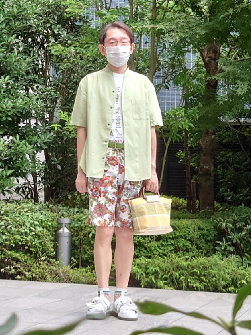 昔、ビーナスフォートで買った、花柄のハーフパンツをベースに合わせました。すこしグリーンが入ってたので、それに合わせてノーカラーシャツはABAHOUSE、中のTシャツは40ct&525、ベルトはLACOSTE、ソックスはChup、サンダルはDr.Martensです。今日も、どこかに行こうかと思ってたけど、結局コンビニにしか行けなかった。夕方は雨降りそうだったし。