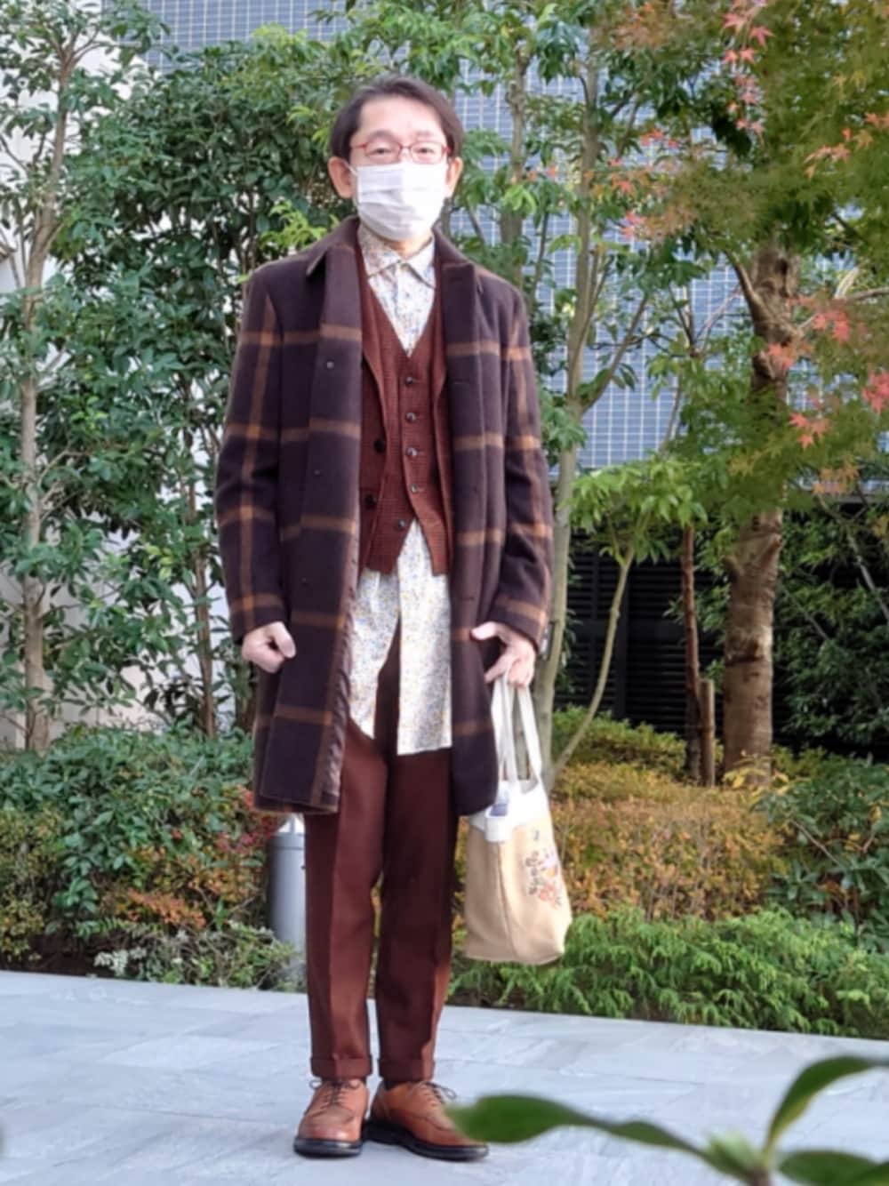TAKEO KIKUCHIのウィンドペンステンカラーコートです。23AWです。中のセットアップは、40ct&525で、オレンジのガンクラブ柄です。ジャケットとベストのセットアップで、パンツは似た色ですが、バーズアイ柄の40ctです。ベルトと靴、アーガイル柄のソックスはTAKEO KIKUCHIです。 中の長いシャツは、TAKEO KIKUCHIのオーダーシャツで、LIBERTYです。 今日は出社日なので、こんな感じです。