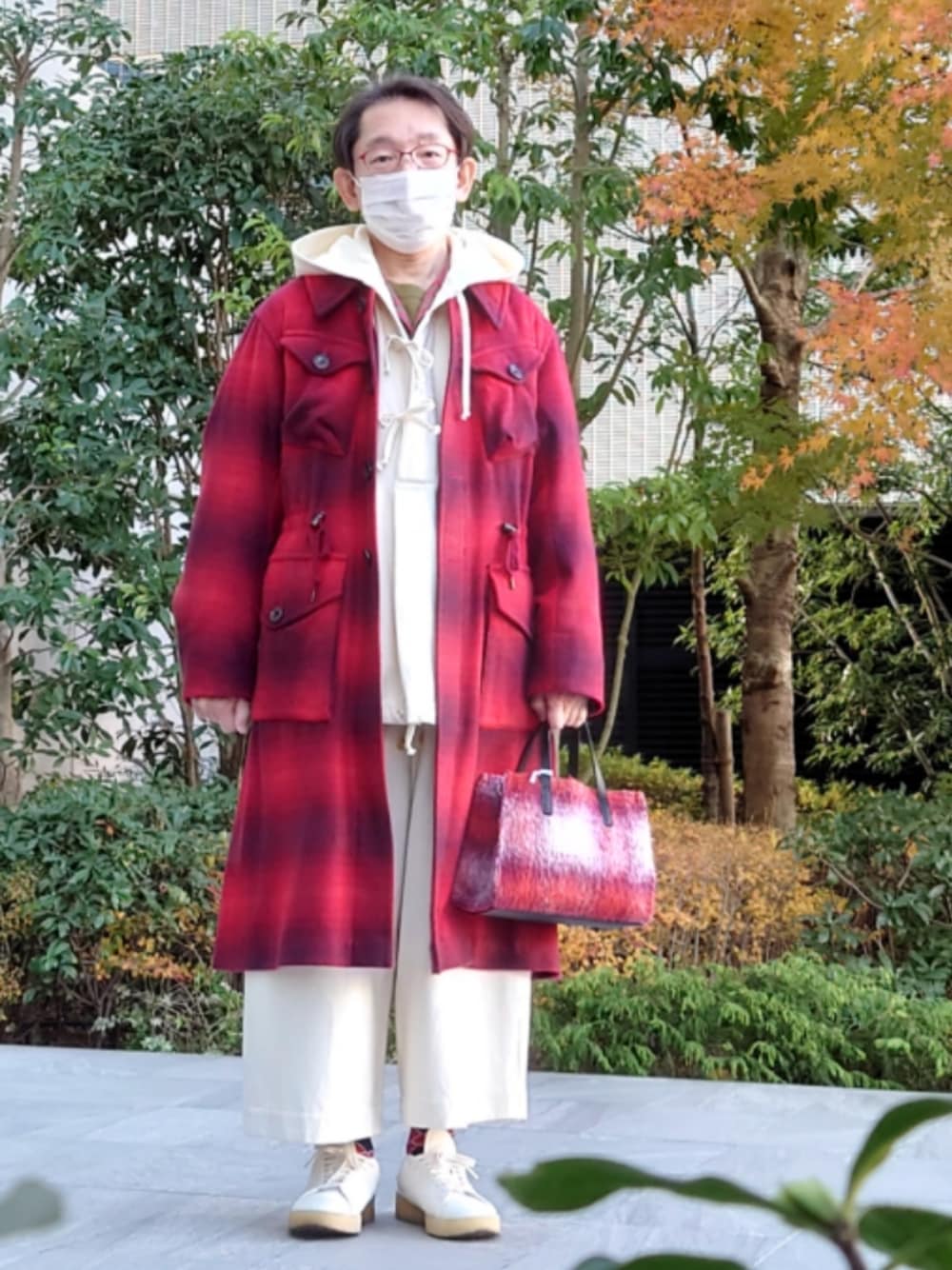 40ct&525のパーカーとワイドパンツのセットアップです。フワフワな素材です。パンツはグルカパンツです。中のシャツは40ct&525の赤と緑チェックです。その中のTシャツも40ctです。アウターは、パンツとのセットアップですが、今日はコートだけです。靴はTAKEO KIKUCHI買い付けのadidasスタン・スミス、ソックスも40ctです。 今日は東京大丸の京橋千疋屋で、ル・レクチェパフェを食べました。