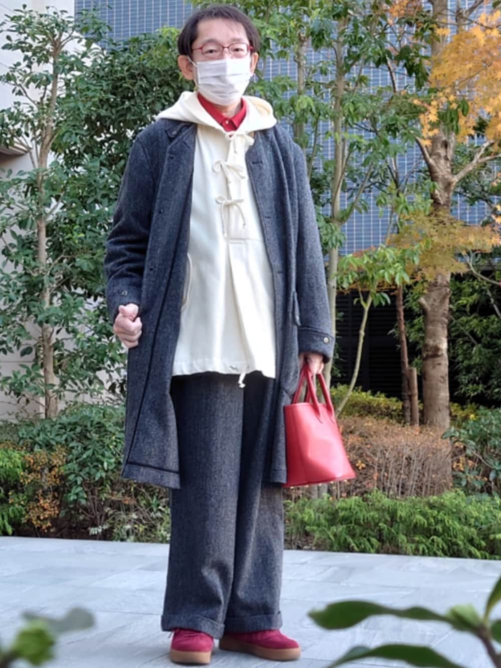 40ct&525のノーカラーヘリンボーン柄コートと3タックワイドパンツのセットアップです。同じシリーズにジャケットもあるのですが、買わなかったです。普段グレーは買わない色ですが、8年前の40ct新宿高島屋TAKEO KIKUCHI別注のジャケットと似た柄だったので買いました。中のパーカーは40ctのフワフワ生地のです。その中のシャツも40ctです。パンツは40ctのサスペンダーで吊ってます。ソックスとオーダーバッグはTAKEO KIKUCHI、靴は40ctのAF-1です。 今日は元旦なので、紅白にしてみました。実家に帰る前に東京駅の改札の外にある菊廼舎で冨貴寄買おうと思ったら、その売店だけ布が掛かっててお休みでした。諦めて違うのを買いました。