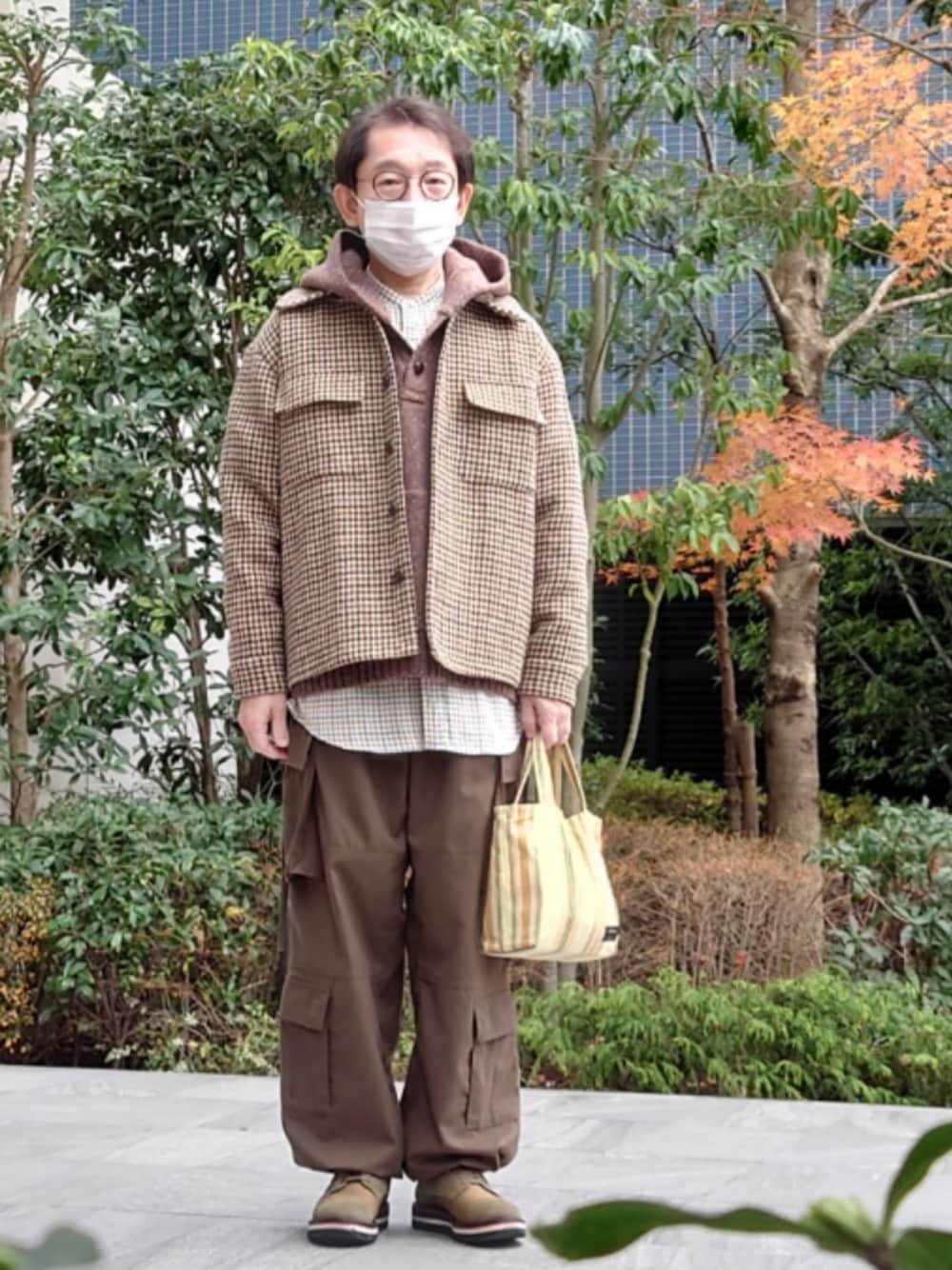 40ct&525の24AWのハリスツイードブルゾンとニットパーカーです。ニットパーカーは、くるみボタンです。その中のシャツは、Paul Smith Collectionのバンドカラーシャツです。 パンツはtk.TAKEO KIKUCHIの24AW、靴は40ctです。 今日は、東京駅の果実園リーベルで、紅白イチゴパフェを食べました。
