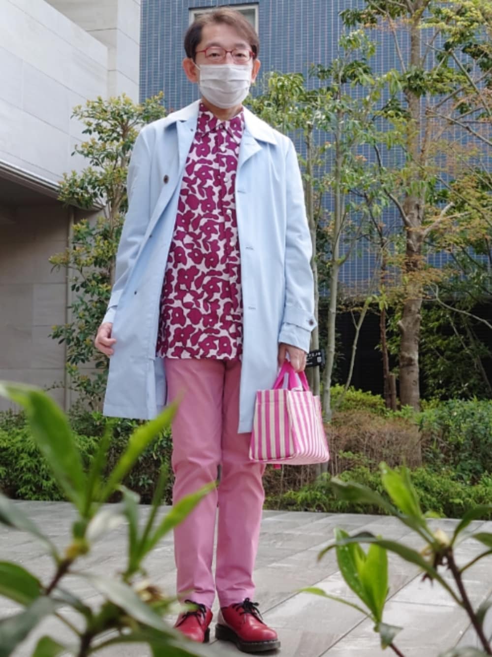 40ct&525リネンシャツです。パンツはTAKEO KIKUCHI、コートはメンズメルローズです。ベルトはLACOSTE、ソックスはTAKEO KIKUCHI、靴はDr.Martensです。 まだ桜の時期なので、ピンクでまとめました。