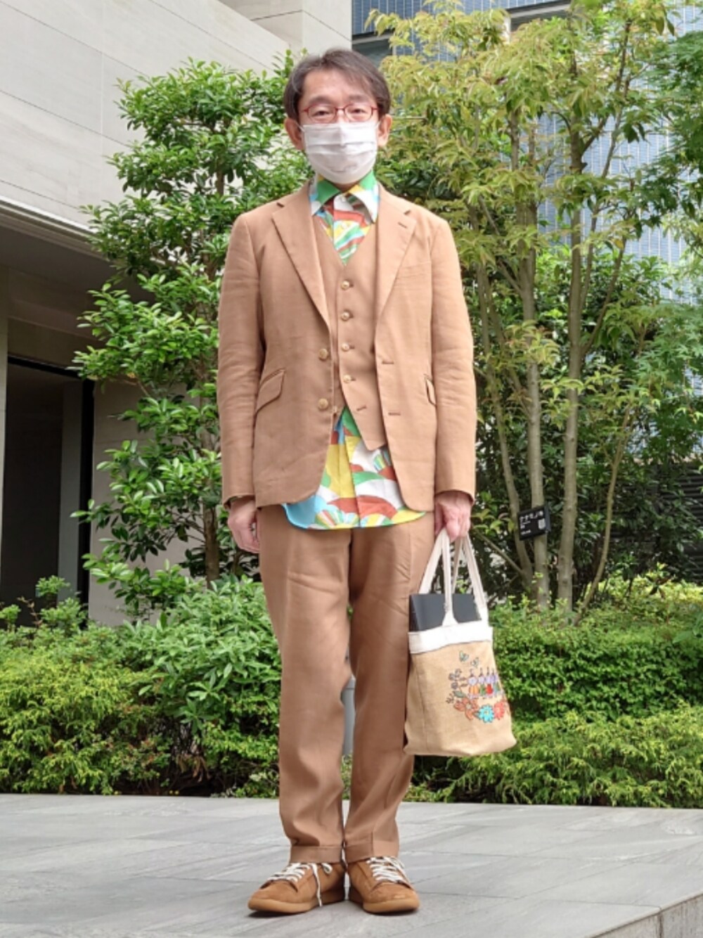 40ct&525のリネンセットアップと40ctの25SSのLIBERTYシャツです。ソックスも40ct、ベルトと靴はTAKEO KIKUCHIです。今日は会社に来客があって出社したので、こんな感じです。だからバッグにパソコン入ってます。 靴は先週ワールドのサイトで買ったばかりです。割と合うものが多いです。今日は、果実園リーベル東京駅店に昼頃行ったら、時間帯が早すぎてランチタイムだったから、食べたいパフェは無かったです。だから、席に座ったけど、帰ってきました。