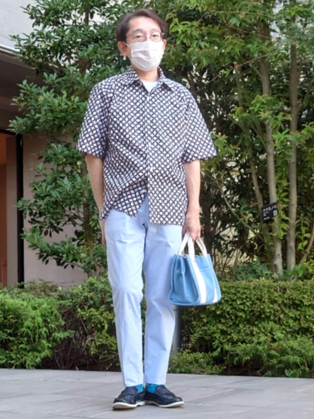 40ct&525 MONTI幾何学模様シャツです。ニュウマン高輪のDRESSTERIORに行こうかなと思って、DRESSTERIORの服の柄に似たこれを着てみました。結局行かなかったのですが。中に着てるTシャツはTAKEO KIKUCHI、パンツもTAKEO KIKUCHIです。ベルトはGAP、ソックスはPaul Smithの水玉模様の。靴はカミナンドです。バッグはシュラルーで、水色でまとめました。 今日はまた少し暑くなりました。京浜急行の新馬場に用があって出掛けました。
