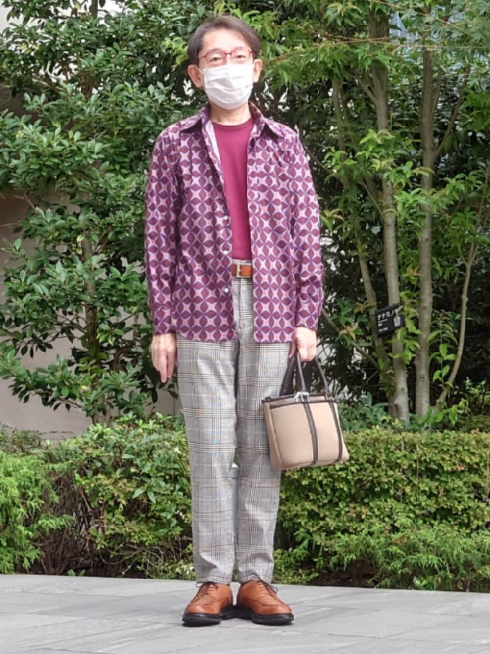 40ct&525 LIBERTY幾何学模様シャツです。中のカットソーも40ct&525、パンツはa.v.v、ベルト、ソックス、靴はTAKEO KIKUCHI、バッグもTAKEO KIKUCHIです。 今日はだいぶ涼しかったです。夕焼けもすごくきれいでした。やっと秋らしいコーデに取り組めそうです。