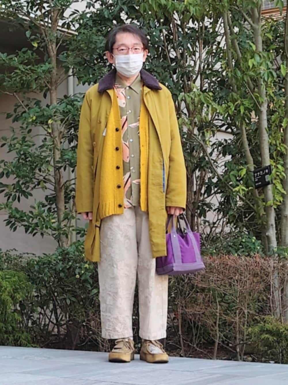 Paul Smith 26SS 金魚のシャツです。3色展開(グレー、グリーン、チェリー)のグリーンです。アウターもPaul Smithです。パンツもPaul Smithで、Leeコラボモデルです。カーディガンはtk.TAKEO KIKUCHIです。ベルトはLACOSTE、ソックスはUNIQLO JWAnderson、靴は40ctの買い付けのClarks Originalです。 今日は体調が少し良くなったので、日比谷シャンテの果実園リーベルでマンゴーパフェを食べました。それから、頼んであった、金魚柄のシャツと同じ柄のソックスを取りに行きました。そしたら、金魚柄のシャツのチェリーがすごく良かったので、取り寄せを頼みました。