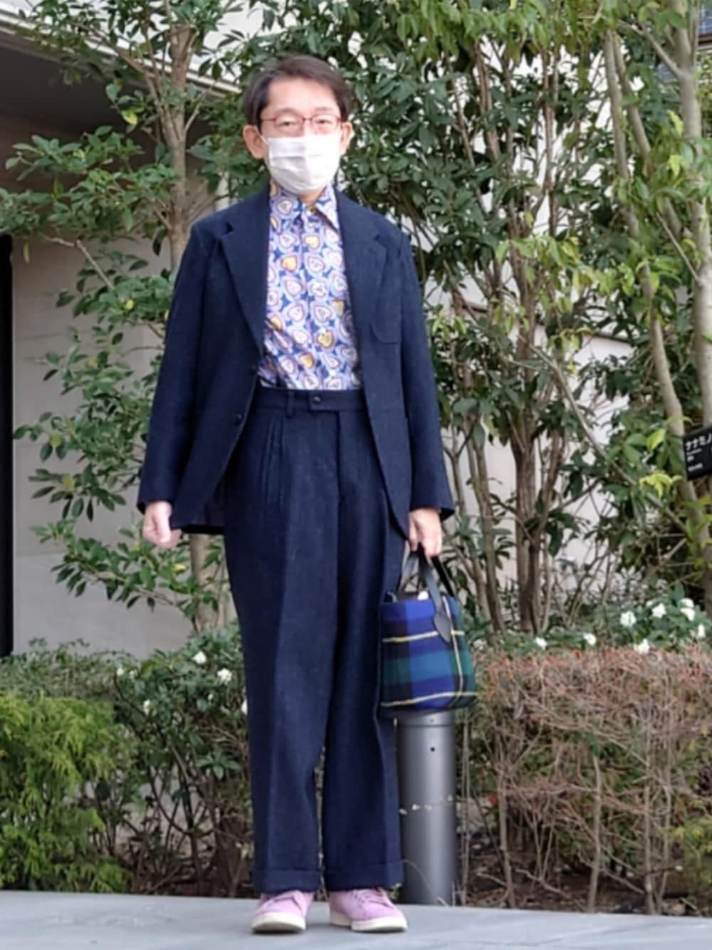 40ct&525ヘリンボーン柄セットアップです。紺色です。中のシャツは、40ct&525のLIBERTYシャツ、パンツは40ctのサスペンダーで吊ってます。ソックスはTAKEO KIKUCHI、靴はピンクっぽいパープルです。adidasスタン・スミス、バッグはグリーンレーベルリラクシングです。今日は出社日だったので、パソコン持ってます。
