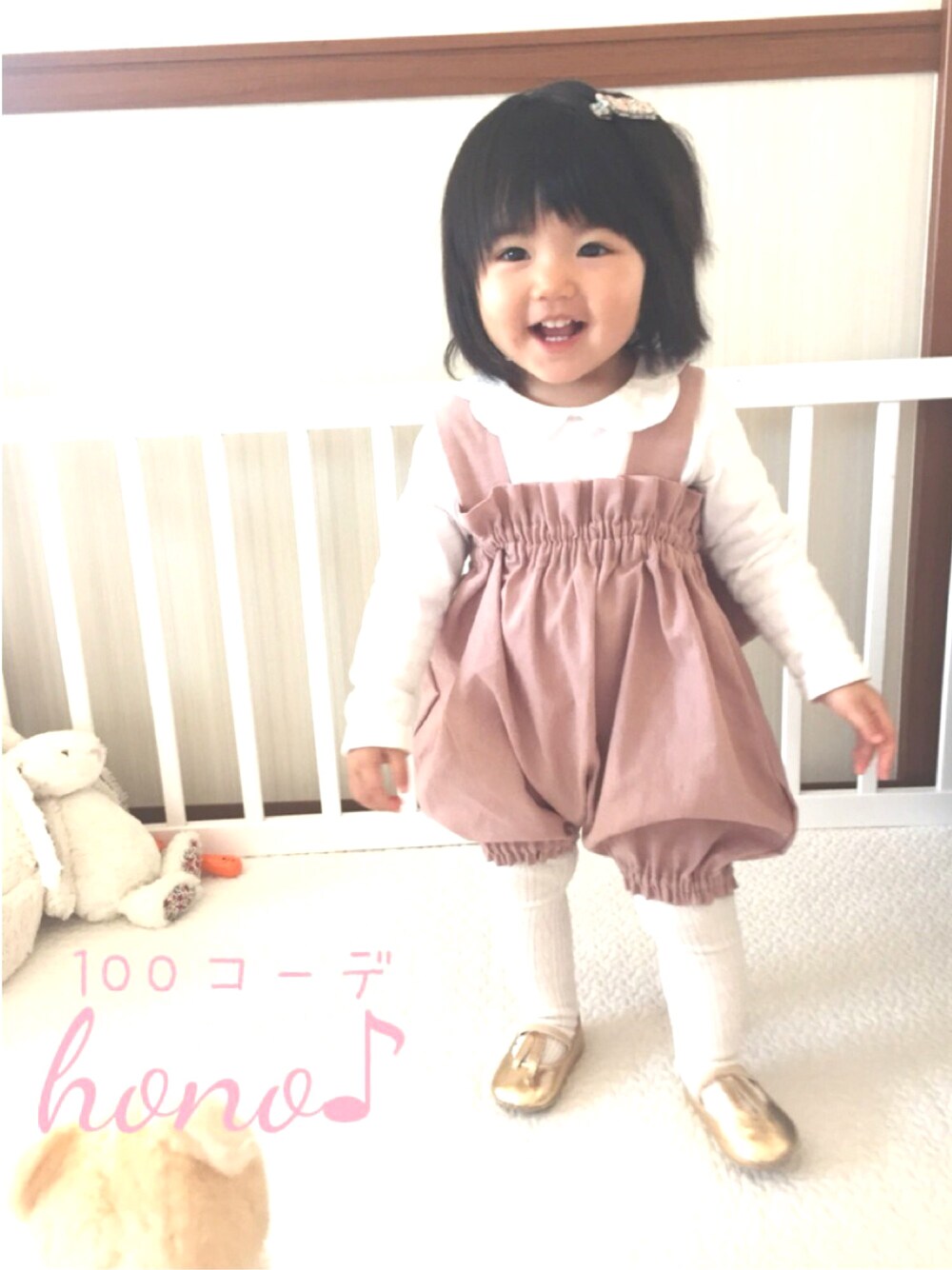 記念の100コーデ❤️❤️❤️ ハンドメイド作家さんの4ウェイかぼちゃサロペットを着てみました✨ 後ろはリボンで結んでいて、どこから見ても可愛いお洋服でお気に入りです😍大きくなったらベルトを取ってウエストに巻き、かぼちゃパンツとしても履けるそうです! 私もハンドメイドできたらなぁーーーーー🙈💦