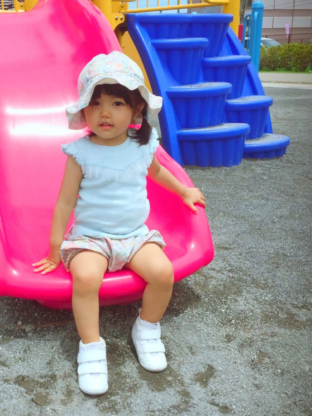 今日はばーばが買って来てくれた プチマインのトップスを初着用💕 チュールが付いていて、爽やかなアイスブルーで なかなかのお気に入り😊 リバティのマーガレットアニーで作ってもらった カボパンと帽子もとーってもお気に入り❤️