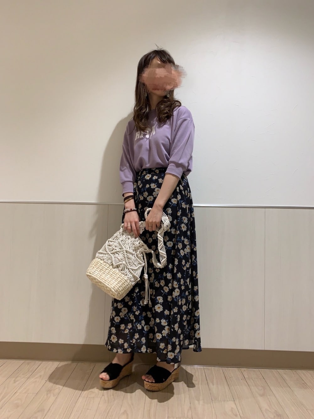 パープルスエットトップス×花柄スカート カジュアルになり過ぎず ガーリーになり過ぎないスタイルにしました。 パープルは今年の流行なので 普段あまり着ないのですが着てみました😍 トップスには「Rita」って書いて あるのですが、どういう意味だろ?って 思いつつコーデ組んでました😂笑