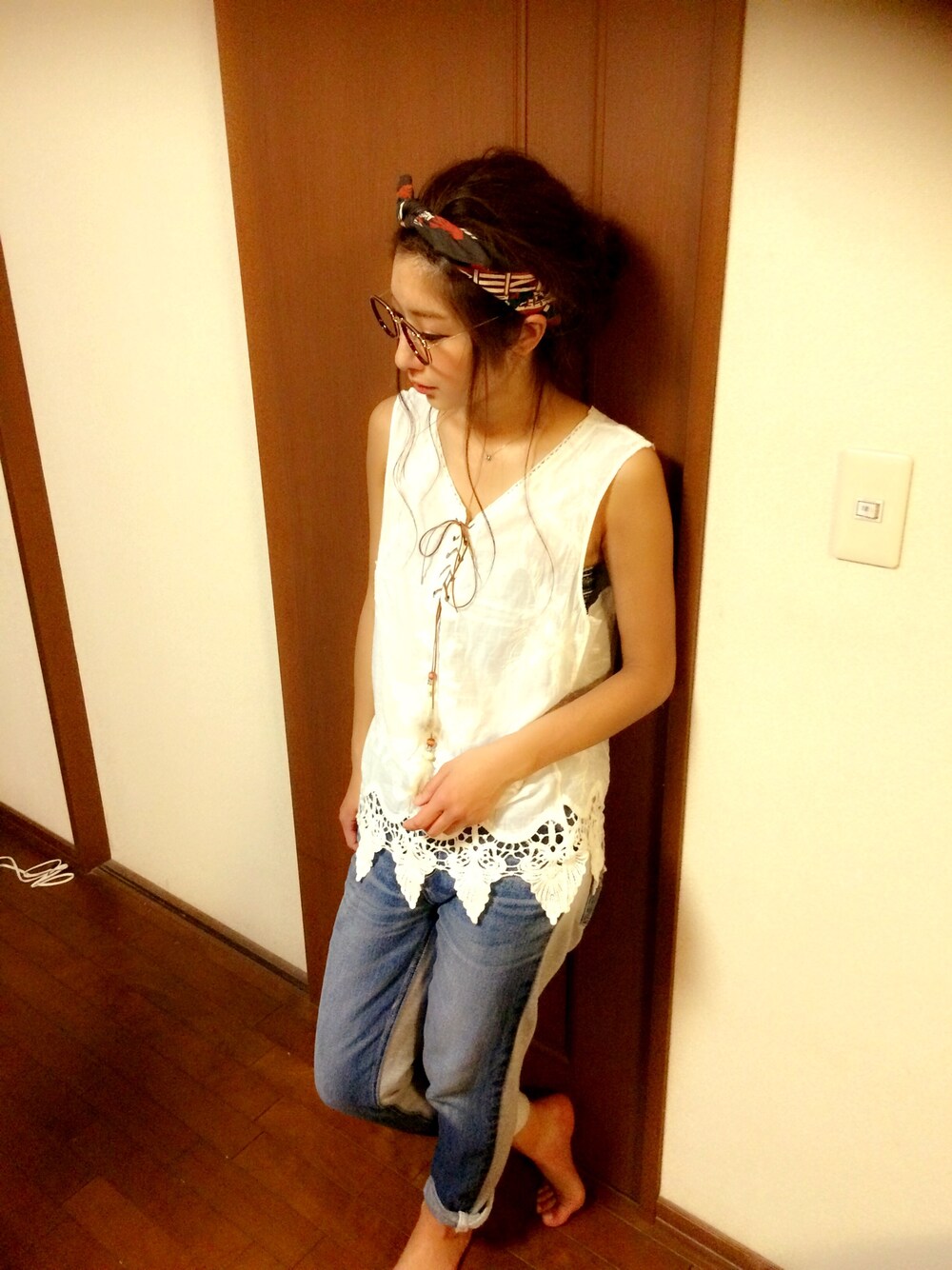 んちゃのデニムパンツ「クラッシュ コンビ テーパードパンツ」を使ったコーディネート