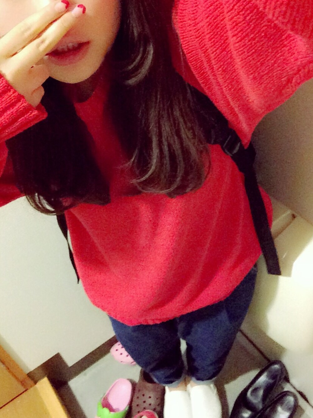 メンズのだぼだぼニットを着てます。 パンツにインして、丈を調節してます。 お友だちのお家の玄関で、ぱしゃり。
