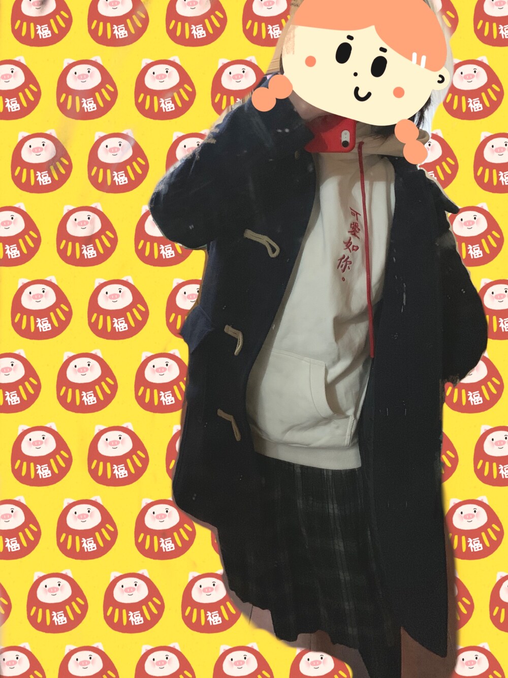 ブルー系のダッフルコートを着用したレディースの冬コーディネートの1枚目の写真